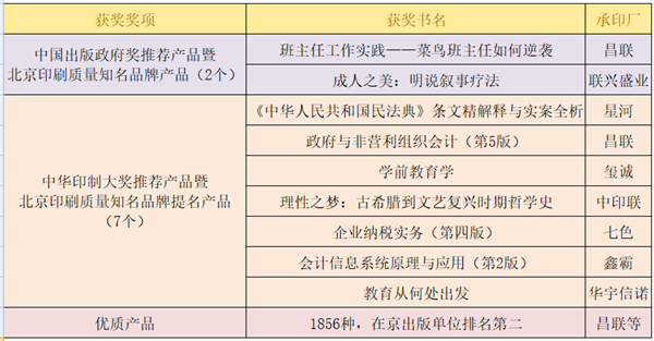 日前,北京印刷协会、北京印刷工业产品质量监督检测站组织的2021年度印刷质量认定结果公布,中国人民大学出版社再创佳绩:2种图书获评“中国出版政府奖推荐产品”暨“北京印刷质量知名品牌产品”(原“质量大奖”);7种图书获评“中华印制大奖推荐产品”暨“北京印刷质量知名品牌提名产品”(原“质量大奖”提名奖);1856种图书获评“出版物优质产品”,在京出版单位排名第二。