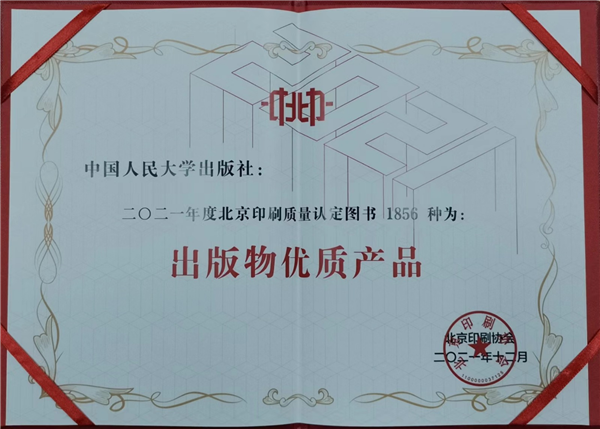 中国人民大学出版社自2011年以来,在北京印刷协会、北京印刷工业产品质量监督检测站组织的印刷质量评比、认定中,成绩一直名列前茅,此前连续十年荣获“优质产品优秀出版单位”奖(2021年度评定单位取消了“优质产品优秀出版单位”奖认定)。2021年,出版社更上层楼,取得了历史最好成绩。中国人民大学出版社将继续秉持工匠精神,始终坚持全程质量管理,不断完善印装质量保障体系,为高质量发展提供坚强保证。