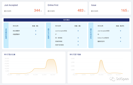 期刊流量统计:显示期刊用户访问数、页面跳出率、平均访问时长、论文点击、阅读、下载趋势和访问来源等数据