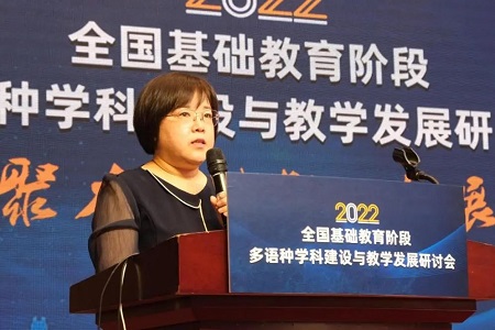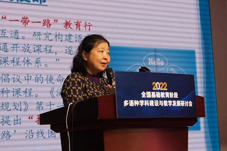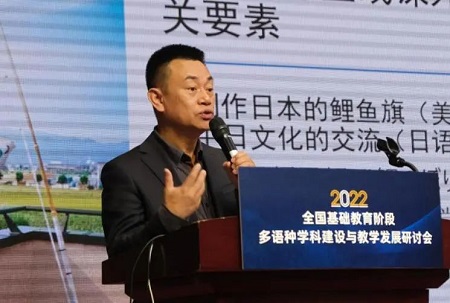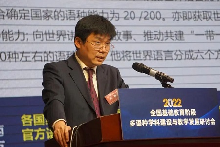 研讨会上,北京外国语大学党委常委、副校长赵刚教授做了题为“发展基础阶段多语种教育是时代的召唤”的主旨报告。赵刚教授在报告中指出,虽然当今世界形势正在发生深刻变革,但世界各国的联系日趋紧密,在全球化进程中,中国积极发展全球伙伴关系,推动构建人类命运共同体。中国的对外开放格局、现代化进程和科技的进步让国家对人才的需求也更加多元。通过在基础教育阶段开设多语种教育,通过在基础教育阶段开设多语种教学,能够培养出更多的与世界沟通,深入理解世界复杂性、多样性,帮助中国更好走向世界的人才。2021年9月25日,在北京外国语大学建校80周年校庆前夕,习近平总书记在给北外老教授们的回信中,要求北外“在推动中国更好走向世界,世界更好了解中国上作出新的贡献”。在基础教育阶段加强多语种教育,对于提升国家语言能力,开发青少年思考能力、多元文化理解能力具有重要意义。重视多语种教育是国家的需要,是时代的召唤。赵刚教授在报告中对于推进我国基础阶段的多语种教育提出了五个路径,第一要做到进一步加强基础阶段外语教学的语种规划研究;第二要增加多语种教育的人文性特征;第三要加强优质的多语种教学资源开发,积极开拓多语种教师和学生的各类活动和文化交流资源;第四要加强中小学与高校的对接;第五要进一步推进中小学的国际交流。赵刚教授的发言为基础教育阶段多语种学科建设与教学发展坚定了信心并指明了前行的方向。