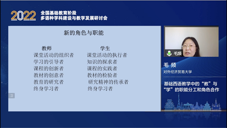 对外经济贸易大学毛频副教授以“基础西语教学中的‘教’与‘学’的职能分工和角色合作”为题,重点阐明了在基础西语教学中教师和学生分别扮演的角色和承担的职能。她强调要增加学生在教师职能中的参与,在教学中以学生为中心,同时要注意教师能力的提升。基础西班牙语教学中教师承担着规划设计、交流互动、教学指导、技术支撑和教学管理的新职能,是学生学习兴趣的激发者、学习行为的引导者与学习结果的评价者。