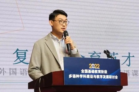 北京外国语大学附属外国语学校多语种教研中心主任廖沧龙老师以“复语复合育英才”为题,分享了学校多语学科建设的经验。他介绍了学校多语课程体系的整体建设情况,强调学校以不同的教学法打造优质课堂,积极开展多语特色学科活动增强学科趣味,组织教研活动提升教师教学能力,关注学生的核心素养与教师的个人发展。