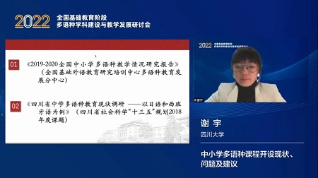 四川大学谢宇老师以“中学多语种课程开设现状、问题及建议”为题进行了分享,首先她结合分中心发布的“2019—2020年全国中学多语种情况调研报告”与其在四川省进行的中学日语和西班牙语学科情况调研数据,阐述了目前全国和四川省开设多语种学校的数量逐渐增多、师资力量较为充足、开设课程呈现多样化等特点。针对四川省中学多语种教育发展的情况和所面临的一些问题,谢老师基于调研的情况提出完善课时规划,做好初高中课程衔接,以课标为导向合理使用中学教材等具体的建议。同时她呼吁学校鼓励教师参加教学培训并积极参与教学研究工作,教育相关部门和学校需要加大宣传力度,才能为基础教育阶段多语种学科的发展奠定良好的社会基础。
