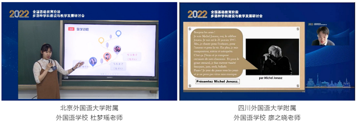 法语分论坛两节示范课由北京外国语大学附属外国语学校的杜梦瑶老师和四川外国语大学附属外国语学校的廖之晓老师分别展示。北京第二外国语学院吴云凤副教授点评到,两位老师课堂上的练习手段和课堂形式新颖有趣、教学环节设计合理并保证了学生在课堂中的高度参与。吴老师建议课堂活动任务切割还需细化,避免学生在较长任务完成时间中跑神,并设置与学生能力契合度相匹配的任务难度。