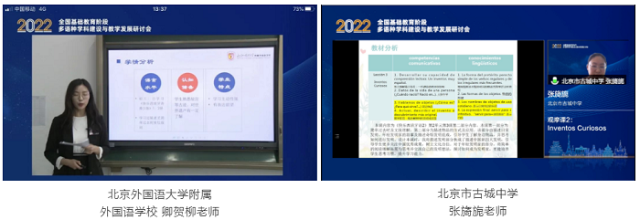 西班牙语分论坛两节示范课由北京外国语大学附属外国语学校的卿贺柳老师和北京市古城中学的张旖旎老师分别展示,对外经济贸易大学的毛频副教授高度肯定了两位老师的教学能力和教学效果。两位老师采取的互动式的教学方法和小组合作的活动形式能够有效提升学生多维度思考的能力、分辨能力以及团队协调等多种能力。