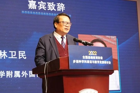 林卫民校长代表北京外国语大学附属外国语学校致欢迎词,林校长表示学校非常高兴能够承办本届研讨会。林校长介绍,北京外国语大学附属外国语学校目前开设七个语种的外语课程,学校以多语种特色教学作为学校发展的关键,来助力全面的教育教学工作。林校长强调,语言是一种力量,是学校发展与学生个人发展的力量,同时也是一种思想和文化,多语种教育有利于培养学生的全球意识与国际理解力。分中心、外研社和北京市海淀区教育科学研究院为全国的中学提供了很好的交流平台。