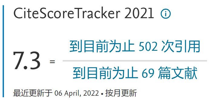 根据Scopus数据库检索结果显示,截至2022年4月6日,GeoSus已发表69篇论文,被引次数共计502次,CiteScore Tracker 2021达到7.3,居于同类期刊CiteScore Tracker 2021 的前列。