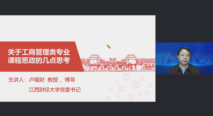全国工商管理专业学位研究生教育指导委员会委员、教育部工商管理类专业教指委委员、江西财经大学党委书记卢福财教授系统阐述了“关于工商管理类专业课程思政的几点思考”,涵盖课程思政的内涵与特征、主要元素、必须具备的三项能力、评价体系等内容,同时介绍了江西财经大学课程思政建设的经验做法。