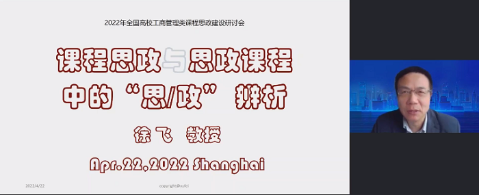 全国工商管理专业学位研究生教育指导委员会委员、教育部高等学校创新创业教育指导委员会副主任、首批国家级课程思政示范课程“战略管理”负责人、上海财经大学常务副校长徐飞教授以“课程思政与思政课程的‘思/政’辨析”为题,由文件梳理入手,全面辨析了思政课程与课程思政中的“思”与“政”及其侧重点,以及如何把握“八大统一”。