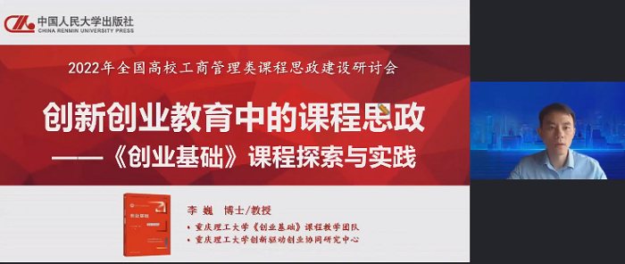 重庆理工大学创新驱动创业协同研究中心主任、首批省级课程思政示范课程“创业基础”负责人李巍教授以“创新创业教育中的课程思政——《创业基础》课程探索与实践”为主题,从高校课程思政的基本要求,创新创业类课程思政的优势与着力点,创业基础课程思政的实践探索、成效及未来方向等方面进行了交流分享。