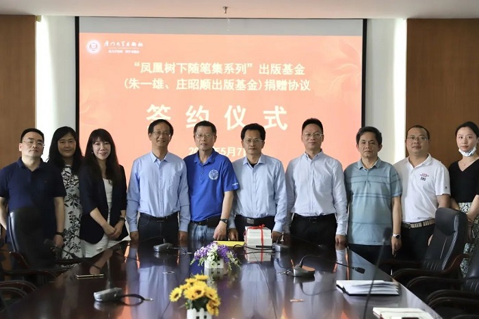 2022年5月7日,正值厦门大学出版社建社37周年。7日上午,厦门大学出版社举行“‘凤凰树下随笔集系列’出版基金(朱一雄庄昭顺出版基金)”捐赠仪式,捐赠方朱多丽和朱希玲的代表、厦门大学校友庄隄,厦门大学出版社党总支书记洪秋霞、社长郑文礼、总编辑施高翔、党总支副书记黄茂林、副总编辑陈进才、副社长欧光江、总编辑助理高健、原特聘编审蒋东明、编辑刘璐等参加仪式。