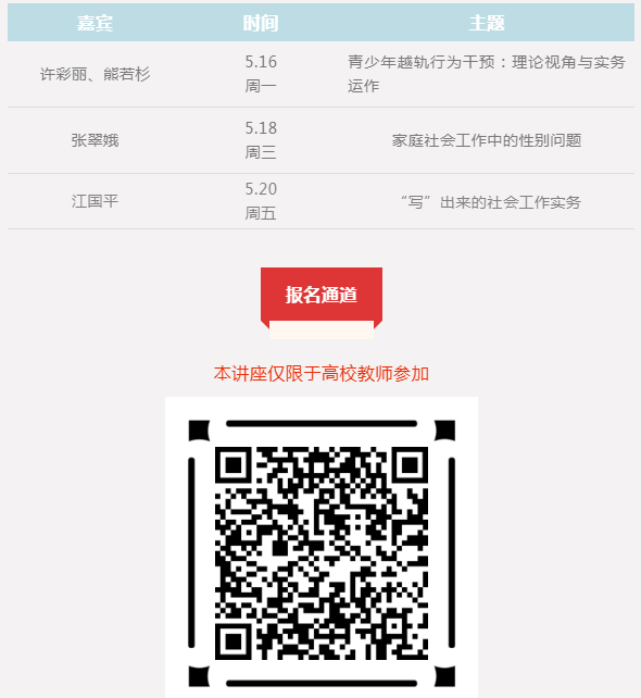 本系列讲座将邀请嘉宾共同探讨社会工作专业教学与实务领域当中的那些大家共同关注的议题。