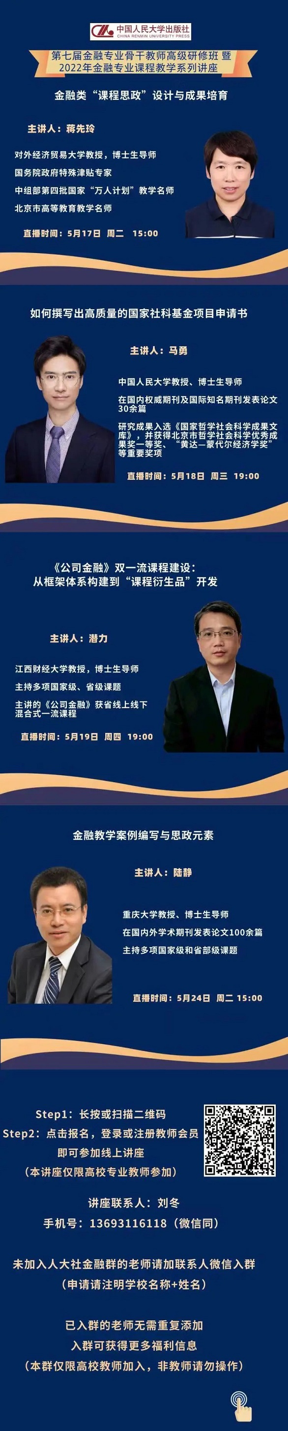 为了深入学习领会习近平总书记的讲话精神,深入贯彻《高等学校课程思政建设指导纲要》,帮助全国经济学教师将课程思政元素有机融入高等院校经济学教学中,在教育部经济学类专业教学指导委员会的指导下,中国人民大学出版社定于2022年5月19日、5月26日、6月2日、6月9日(每周四晚上)举办“2022年全国高校经济学类课程思政教学研讨会”公益讲座。