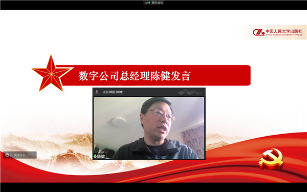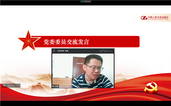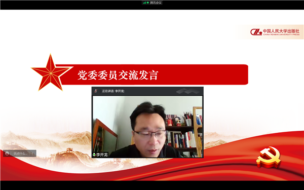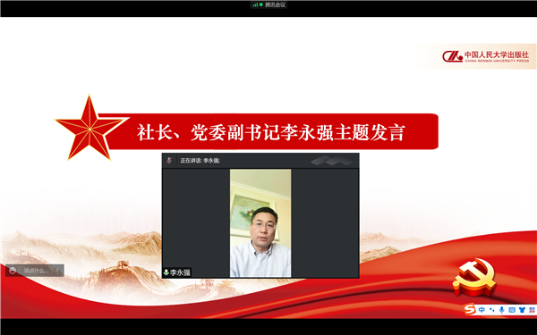 会上,社长、党委副书记李永强做了题为“坚守红色阵地 传播中国声音——深入学习宣传贯彻落实习近平总书记在学校考察时重要讲话精神,推动人大出版社高质量发展”的主题发言。他指出,习近平总书记亲临中国人民大学考察调研,在重要讲话中提出要“发挥哲学社会科学在融通中外文化、增进文明交流中的独特作用,传播中国声音、中国理论、中国思想,让世界更好读懂中国,为推动构建人类命运共同体作出积极贡献”。习总书记的讲话立意高远、视野宏大、思想深刻、内涵丰富,中国人民大学出版社要将这一重要讲话精神与出版业务实际深入结合,按照张东刚书记在全校干部师生大会上讲话中提到的“以至诚的党性和强烈的政治担当,奋进新征程、建功新时代”要求,在主题出版和国际出版业务中把握中国哲学社会科学创新发展的新形势、新课题、新目标,以更高水平、更高质量的出版工作为构建中国自主的知识体系、传播中国声音贡献力量。