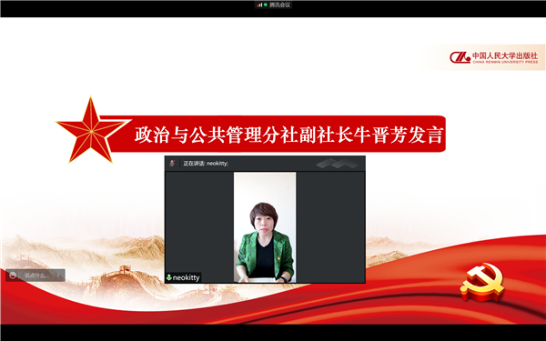 党委副书记、纪委书记刘玮表示,出版社作为主题出版的引领者,应该在习近平总书记重要讲话精神的指导下,坚持马克思主义中国化,坚持以人民为中心的导向,守正创新,利用好我们人大社的主题出版优势,利用好我们的红色基因,助力中国话语和中国叙事体系的构建,讲好中国故事,展现中国故事背后的力量。