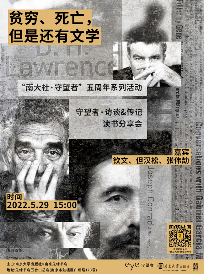 值此“守望者”成立五周年之际,南京大学出版社联合先锋书店,推出“守望者·传记&访谈”阅读分享会。2022年5月29日(周日)15:00,南京大学外国语学院的三位老师——德语文化学者钦文、英语系教授但汉松、西班牙语系副教授张伟劼,将来到先锋书店五台山总店,畅谈贫困、死亡、爱、战争、流亡与文学之间的“相爱相杀”,畅谈文坛巨匠的真实人生与虚构世界,与读者们一起在文学的天空畅游,捕捉闪烁点滴微光的灵感瞬间。