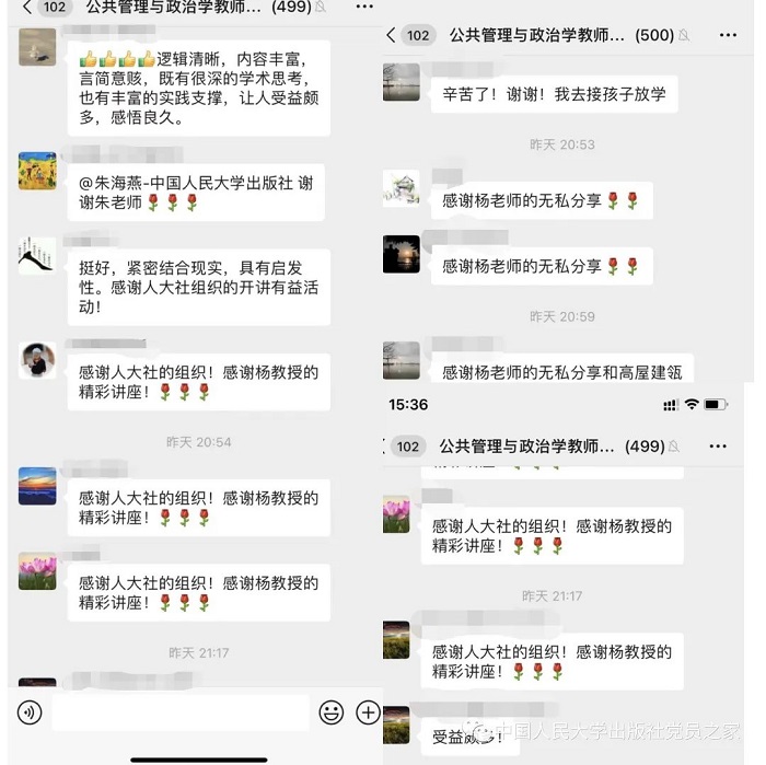 政管分社党员朱海燕虽然身处封控区,仍然克服重重困难,与市场部的同事倾力合作,多次沟通,带领党员朱晓霞和鲍宇龙为公管学科的教师奉献了两场“新时代中国公共管理学科发展系列讲座”直播活动,直播访问人数高达近4000,受到学界的广泛关注。参与直播的教师会员纷纷表示获益匪浅,对主讲嘉宾和人大出版社深表感谢。
