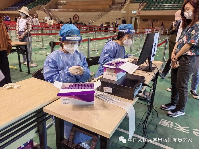 在居家抗疫、做好本职工作的同时,政管分社党员李俊峰和牛晋芳积极参与抗疫工作,加入志愿者服务队伍,承担核酸检测登记的具体工作,为社区防疫献上一己之力。她们用行动继承人大出版社光荣传统和传承红色基因的信念和宗旨,诠释迎难而上的品格和担当。“苔花如米小,也学牡丹开”,她们正在通过点滴努力为早日走出疫情阴霾发光发热。