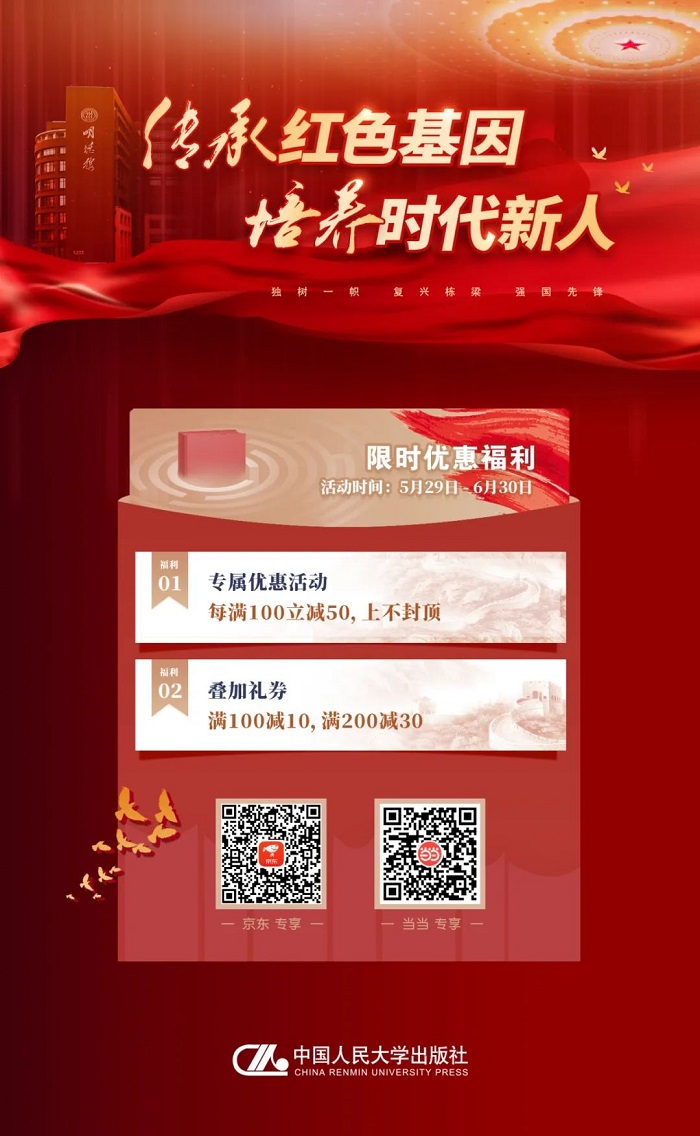即日起至6月30日,人大出版社诚意推出“传承红色基因 培养时代新人”专题荐书活动,活动专题内所有图书享受双重优惠:1、电商平台京东、当当【每满100减50】;2、在此价格基础上,叠加【100减10、200减30】活动礼券。优惠叠加,诚意双倍!