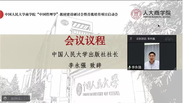 李永强社长致辞表示,本次会议的召开是对习近平总书记考察中国人民大学重要讲话精神的具体落实。教材建设要以中国为关照、以时代为关照,立足中国实际,解决中国问题。人大商学院是国内顶尖的学院,在教材建设方面有良好的传统和传承。人大出版社建社近70年来积淀了大量的成果和荣誉,在首届全国教材建设奖评选中位居大学社第一。出版社与商学院有着多年密切的合作关系,希望在建构中国自主知识体系的道路上,继续携手打造出一套具有新时代意义、影响深远的“中国管理学”系列教材。