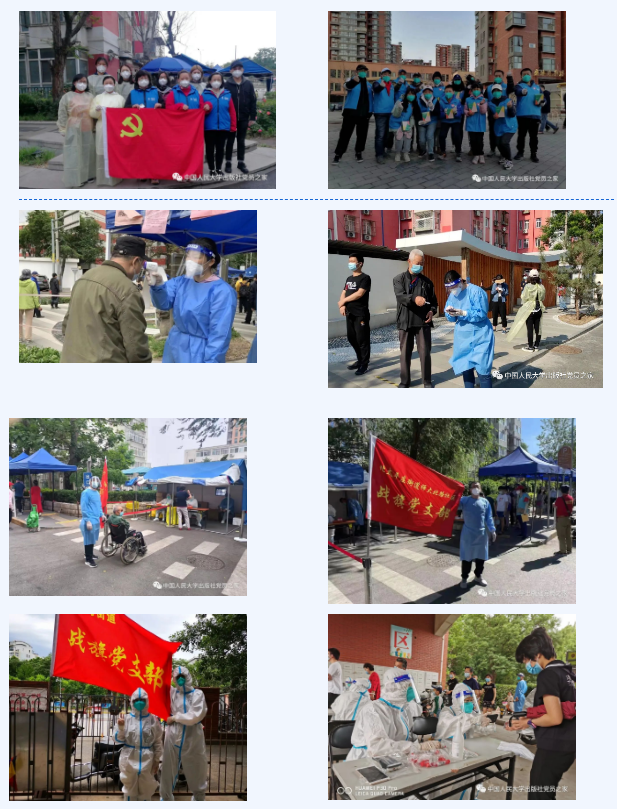 人大社的党员还积极向社区报到,“进社区、亮身份、践承诺、作表率”,就地转化为抗疫志愿者。三月,经济管理支部党员谷广阔同志在社区封控期间,第一时间向社区报到,在海淀区清河街道安宁华庭小区提供志愿服务,负责分拣快递、外卖。财务法律支部党员孟巍得知所在的三虎桥社区5月8日开始组织大规模核酸检测后,积极参加在职党员志愿者服务队,先后五次参加社区核酸检测工作,服务时长累计长达21小时。