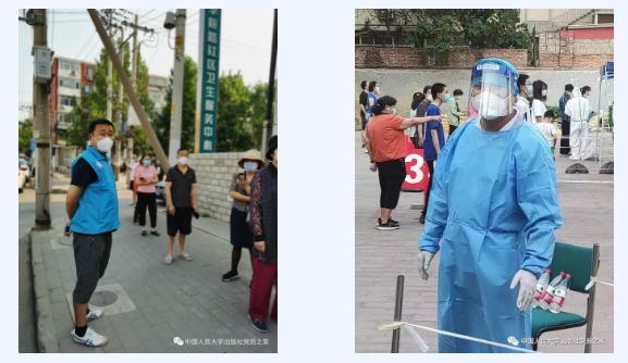 抗击疫情的号角吹响后,中国人民大学出版社的党员和入党积极分子们在做好本职工作的同时,积极响应号召,转化为志愿者奔赴疫情防控一线,成为中国人民大学校园内外靓丽的“一抹蓝”。