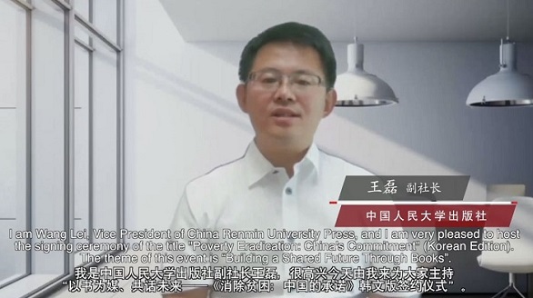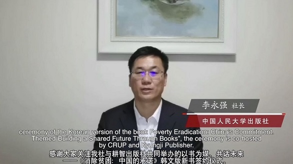 6月1日至5日,2022首尔国际书展在韩国首尔举办。今年适逢中韩建交30周年,值此书展举办之际,6月2日,中国人民大学出版社与韩国耕智出版社在线共同举办“以书为媒、共话未来——《消除贫困:中国的承诺》韩文版新书签约仪式”。中国人民大学出版社社长李永强、韩国耕智出版社社长金胜一通过视频出席签约活动并致辞,中国人民大学出版社副社长王磊主持仪式。