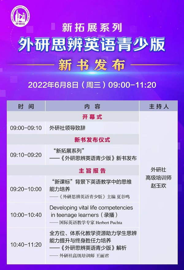 6月8日(周三),外语教学与研究出版社(以下简称“外研社”)将重磅推出“新拓展系列”教程全新产品《外研思辨英语青少版》,诚邀您在云端共同参与新书发布活动。现在已进入直播倒计时!