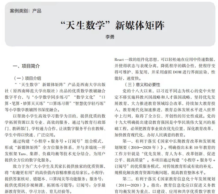 近日,我国首部新闻出版深度融合发展纪年文献——《中国新闻出版深度融合发展年鉴》(2021年卷),由中国出版集团研究出版社出版,向海内外公开发行,新华网、光明网等主流媒体进行了宣传报道。西南大学出版社深度融合创新案例《“天生数学”新媒体矩阵》成功入选。