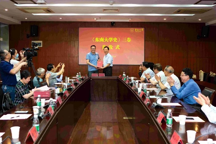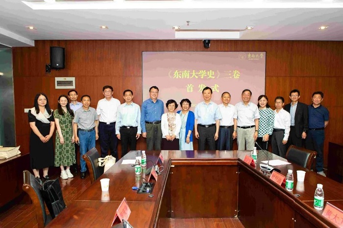 2022年6月1日上午,在东南大学九龙湖校区行政楼会议室,东南大学出版社联手校档案馆和校史研究室,为《东南大学史》三卷本举行了首发仪式,为东南大学120周年校庆献礼。东南大学党委书记左惟,原党委书记胡凌云,原党委常务副书记杨树林、刘京南,副校长黄大卫出席了首发式。资产公司党委书记邱卫东、图书馆馆长李爱国、编纂委员会委员及学生代表等共同参加了首发式。首发式由校党委常委、党委宣传部部长顾永红主持。