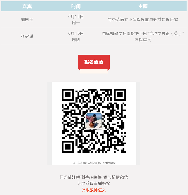 为进一步推进商务英语学科建设,为学科建设提供新思路,中国人民大学出版社邀请山东工商学院刘白玉教授、西南财经大学张家瑞教授开展商务英语专业建设系列直播。