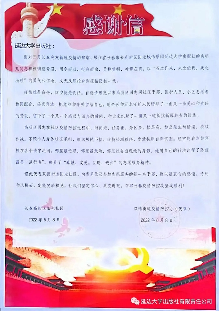 日前,禹明延同志参加志愿服务的长春高新区阳光社区、双德街道疫情防控办给延边大学出版社有限责任公司发来感谢信,高度表扬了禹明延同志在疫情防控工作中的优异表现,并对禹明延同志的志愿服务行动和无私奉献精神表示感谢。