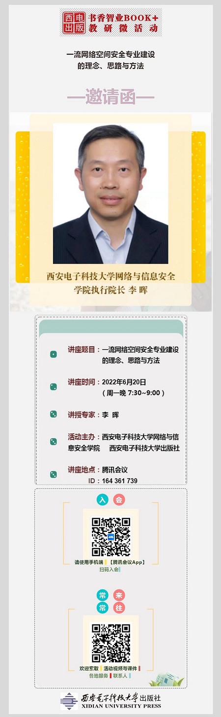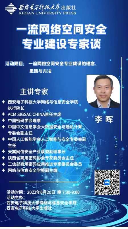 6月20日晚,国家首批一流网络安全学院建设示范项目,西电网络与信息安全学院执行院长李晖教授,系统总结西电网信专业与课程数十年建设发展经验,与您分享一流网络空间安全专业建设的理念、思路与方法。