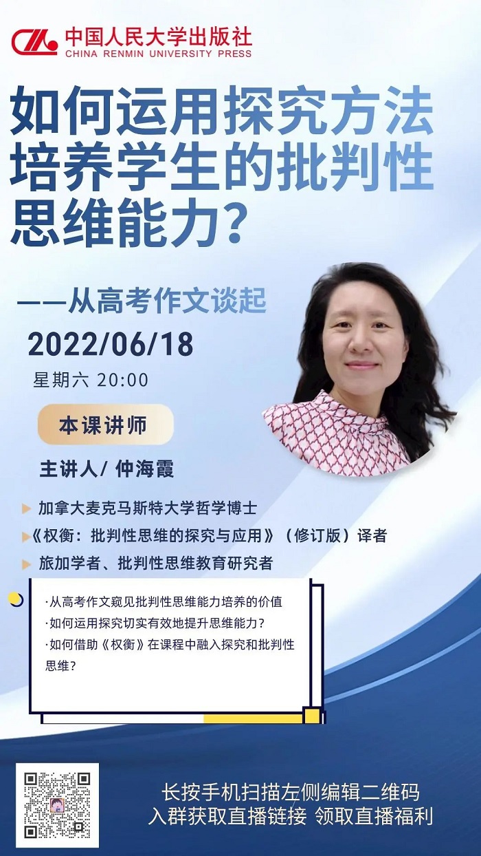 旅加学者、加拿大麦克马斯特大学哲学博士、《权衡:批判性思维的探究与应用》(修订版)译者仲海霞老师线上直播开讲!