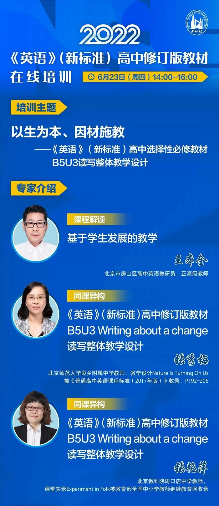 请于2022年6月23日(周四)14:00-16:00准时登录钉钉“外研社·K12教师发展社区”参加本系列培训。北京市房山区高中英语教研员、正高级教师王本全,北京师范大学良乡附属中学英语教师张秀梅与北京教科院周口店中学英语教师张艳萍,将为大家带来“以生为本、因材施教——《英语》(新标准)高中教材选择性必修第二册第三单元读写整体教学设计”分享。敬请关注!