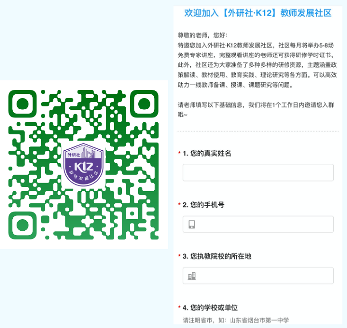 本系列在线培训通过 “外研社·K12教师发展社区”进行。欢迎您的加入。您可以下载钉钉手机APP并使用钉钉扫描下方二维码,填写相关信息,申请加入“外研社·K12教师发展社区”。