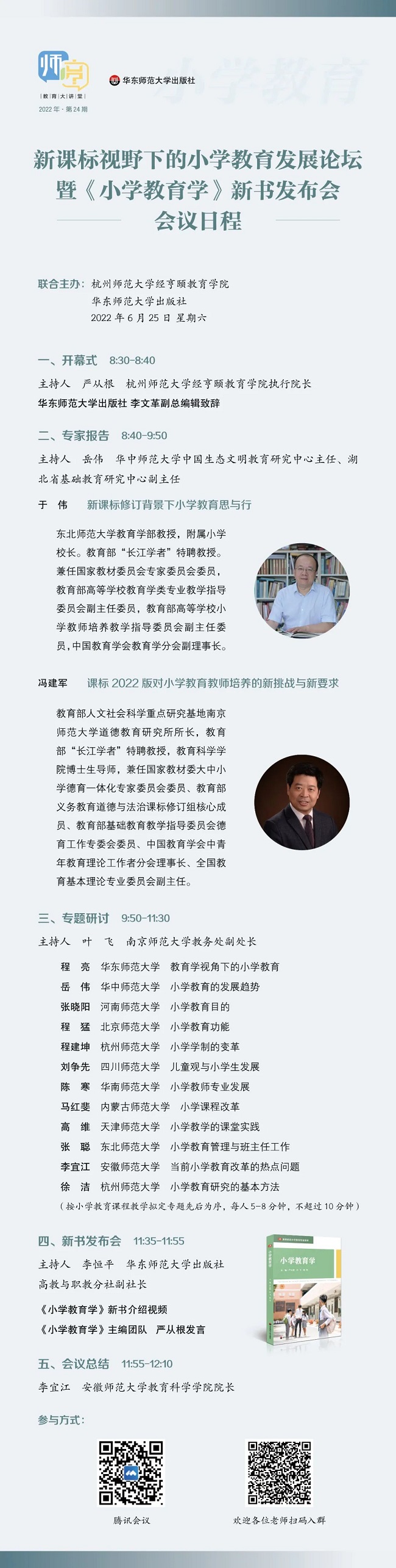为贯彻落实《义务教育课程方案(2022版)》及各学科课程标准等政策精神,从学术研究、人才培养、多样化的实践探索等视角探讨小学教育发展与教育问题,杭州师范大学经亨颐教育学院、华东师范大学出版社联合邀请专家、师范院校教育学院领导、小教专业系主任,推出主题为“新课标视野下的小学教育发展”的高峰论坛暨《小学教育学》新书发布会。本次高峰论坛将秉持有视野、重专业、能落地、可实操的办会风格,进行深入研讨和对话交流。会议相关信息如下。