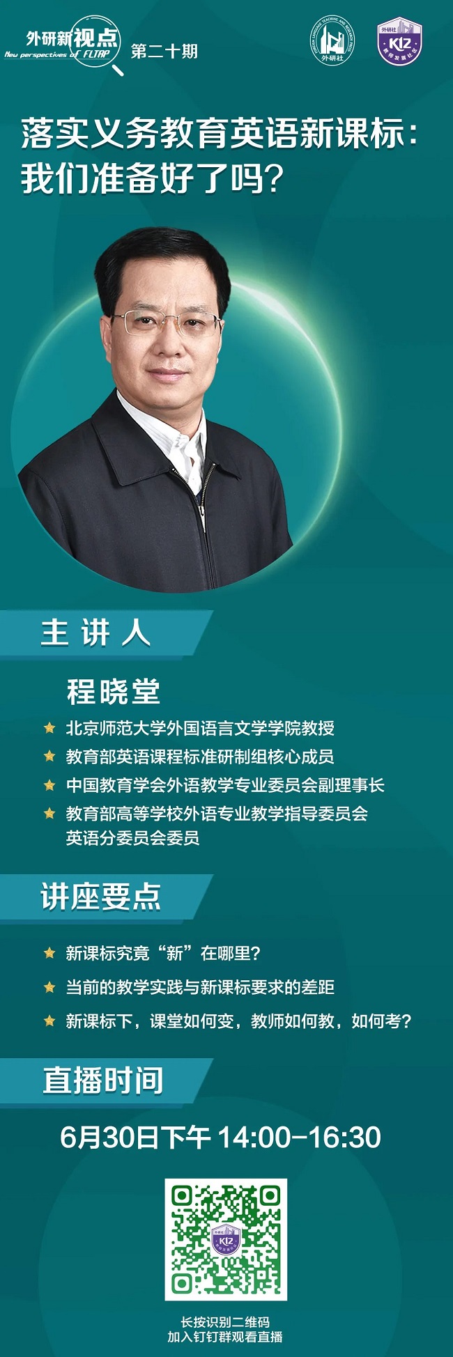 针对这些一线教师最为关心的问题,6月30日下午14:00-16:30,“外研新视点”有幸邀请到了义务教育英语课程标准修订组核心成员程晓堂教授来到直播间,为一线教师解疑答惑!希望这场直播可以帮助一线教师深入理解“新课标”,让英语教学更加高效,发挥学科育人作用,全面提升学生的核心素养。