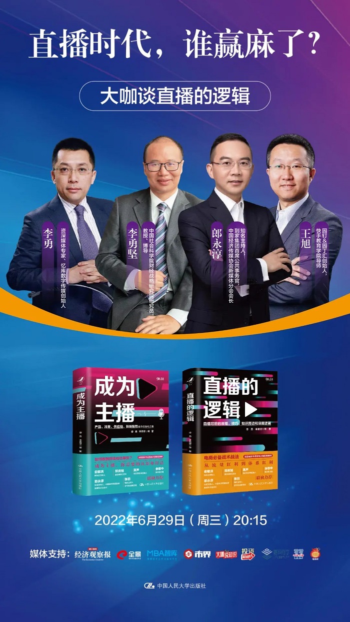 6月29日,周三 20:15-22:00 李勇、李勇坚、郎永淳、王旭 同你谈谈直播的逻辑—— 直播时代,谁赢麻了?