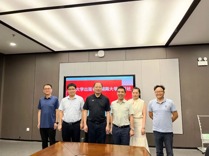 在湖南大学出版社,与社长李文邦、总编室主任陈建华、营销部主任朱治国,就大学社图书选题规划、经营与管理、绩效考核及分配、营销发行、数字出版对外合作管理等问题进行了沟通和交流。