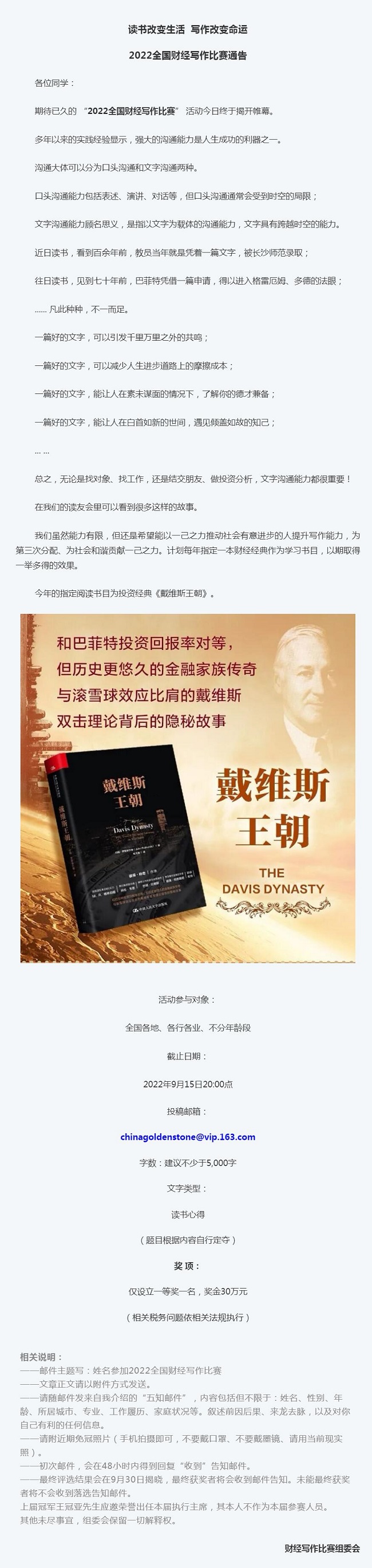 读中国人民大学出版社《戴维斯王朝》赢30万奖金!2022全国财经写作比赛隆重开幕
