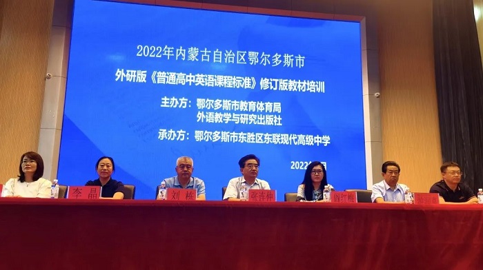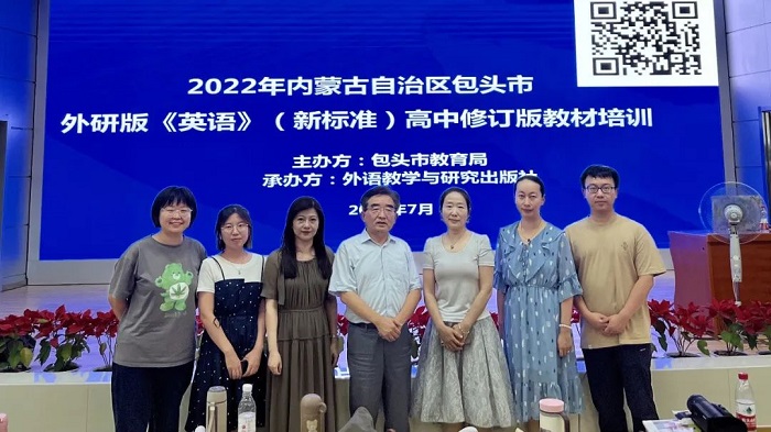 为贯彻落实教育部《关于做好普通高中新课程新教材实施工作的指导意见》和《新修订普通高中课程方案和课程标准培训工作方案》的文件精神,根据内蒙古自治区教育厅《自治区普通高中新课程新教材教师培训方案》的相关要求,助力内蒙古自治区高中英语学科新课程新教材实施,帮助内蒙古自治区高中英语教师进一步准确把握新课程理念,更好地使用新教材,2022年7月22日-29日,外语教学与研究出版社(以下简称“外研社”)组织培训专家团队相继赴乌海、包头、鄂尔多斯、呼和浩特四地市,开展“2022年内蒙古自治区外研版《英语》(新标准)高中修订版教材培训”,近两千名高中英语教师参加了培训,活动取得圆满成果。