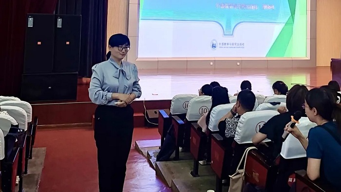 王金鑫以教材必修第一册第五单元为例,详细介绍了教材的单元设计原则、单元整体课时划分、教学目标设定、教学活动实施和教材使用心得等方面内容。她指出,外研版教材的单元主题是由若干话题组成的一条话题链,话题链内部具有完整性、系统性和关联性,是主题意义探究的基础,也为单元内部各板块之间在学习上的自然过渡提供了条件。她建议老师们要注重学生的生活体验与单元的话题之间的关联,为学生的深入学习、巩固知识、发展认知与情感提升打好基础。