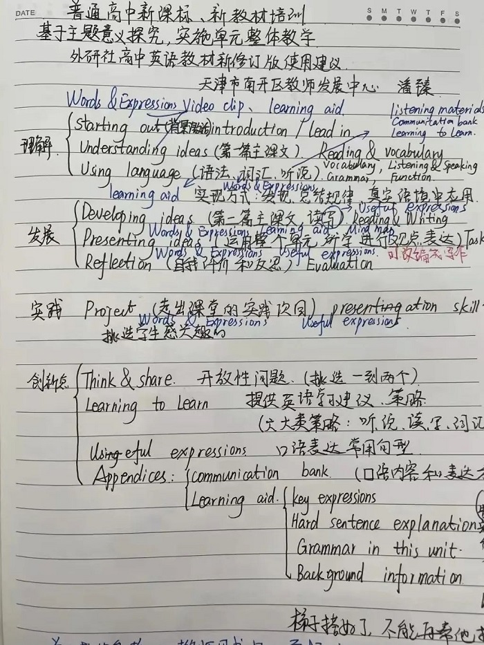 作为第一批使用新教材的青年教师感到责任重大,能否把新教材新理念应用到教学实践中,充分发挥新教材的引领作用?通过本次培训,我收获颇丰。关于如何有效地进行高中英语单元整体教学设计,改变传统教学观念,深入理解英语核心素养并切实应用到教学实践中,专家们用真实的教学案例进行了系统的分析解读。通过此次学习,我对新教材的板块有了深入的了解,对接下来新教材的使用有了一定的把握,此次培训干货满满。我一定会在以后的教学中坚持以学生的“学”出发,通过设计创新、理念创新和方式转变引导学生学习语言知识和文本内容,在发展语言能力、文化意识、思维品质和学习能力的过程中,潜移默化地实现对学生的生命教育和品德教育,不能再像过去一样只注重词汇、语法知识点的教学,我将认真研读新教材,在教学实践中不断尝试反思、不断成长!
