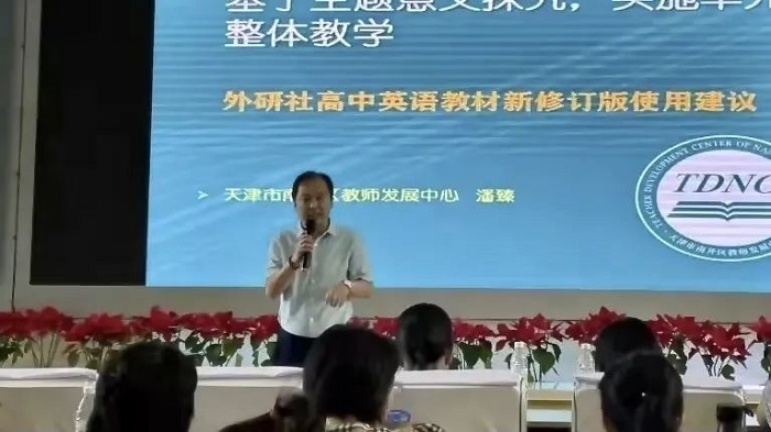 雷传利以“认识新教材,落实新理念”为主题,对教材进行了深度解析。他指出,新教材的整体设计思路是从“理解”到“发展”再到“实践”的一套完整的、发展的学习过程,整个单元的学习板块环环相连,符合认知发展要求和语言学习要求,突出了学生综合语言能力的发展。