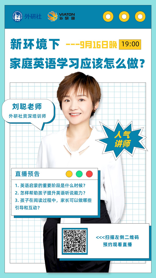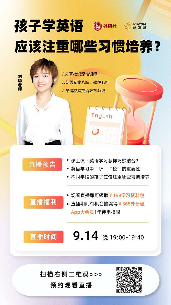 今晚(9月14日)19:00,外研社资深培训师刘聪老师和Sophie老师将直击家长们的痛点,手把手教各位引导孩子掌握英语学习的方法,培养良好的英语学习习惯。