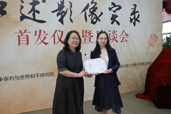 座谈会上,上海广播电视台纪录片中心陈亦楠工作室负责人陈亦楠与上海交通大学出版社数字产业部主任、电子音像社社长刘敏对“口述影像实录”的创作背景、拍摄历程、出版意义、社会价值等进行了介绍。还举行了战争审判与世界和平研究院特聘研究员聘书授予仪式及《口述影像实录》揭幕仪式。