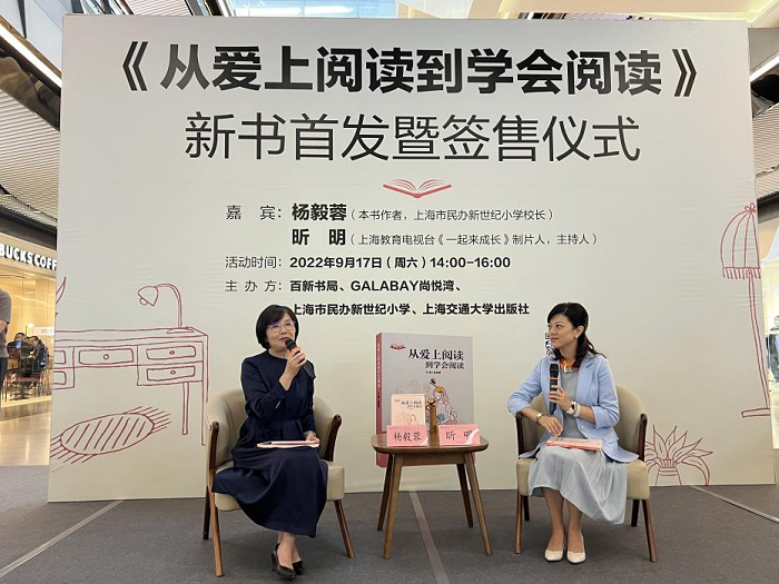 2022年9月17日下午,《从爱上阅读到学会阅读》新书首发暨签售仪式在尚悦湾广场顺利举办。本次活动由百新书局、尚悦湾广场、上海市民办新世纪小学、上海交通大学出版社主办。本书作者、上海市民办新世纪小学校长杨毅蓉与上海教育电视台《一起来成长》制片人、主持人昕明到场,分享《从爱上阅读到学会阅读》一书的创作历程,探讨亲子阅读的方法与意义。