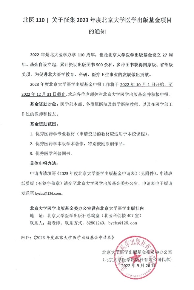2023年度北京大学医学出版基金申报工作将于2022年10月1日开始,至2022年12月31日截止。欢迎各位老师关注北京大学医学出版基金并积极申报。