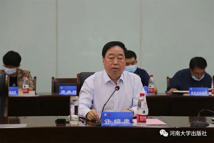 许绍康在讲话中表示,以“新百年再出发”为主题出版的一系列丛书,涵盖了河南大学深厚的历史纵深和广阔的历史维度,梳理学校发展的历史,诠释学术传统、学术流派、学科特色,展示了河南大学110年来的峥嵘岁月、今日成就和河大人“自强不息,百折不挠”的精神风貌,是对学校办学传统、办学经验、办学优势的一次全面总结与升华,有助于全校师生和社会各界对河南大学在中原和全国高等教育中的历史定位与奋斗目标产生清醒而坚定的认识,有助于推动河南大学“双一流”和“双航母”建设步伐,也必将成为加强大学文化建设的有益借鉴,推动学校在精准服务国家战略和区域高质量发展的道路上取得新的更大突破。他希望出版社以此次校庆系列图书的出版作为契机,围绕省委双航母发展战略的决策部署,依托学校深厚的学术根基,服务好学校的教学和科研,推动学校在精准服务国家战略和区域高质量发展的道路上取得新的更大突破,策划出版更多无愧于党、无愧于人民、无愧于时代的精品力作,为研究型综合性一流大学建设提供强有力的支撑。
